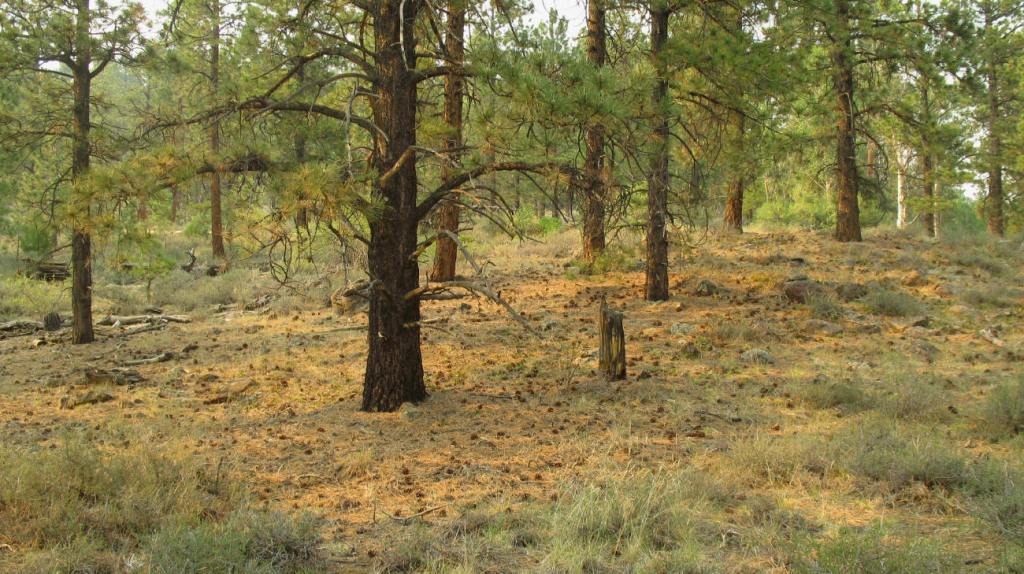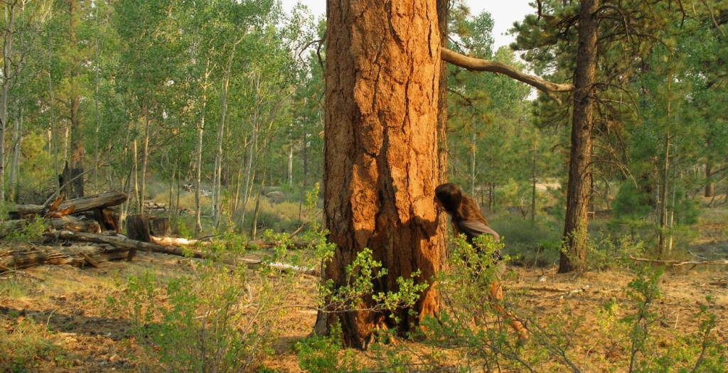 The shadow of a tall red pine has a grey color.