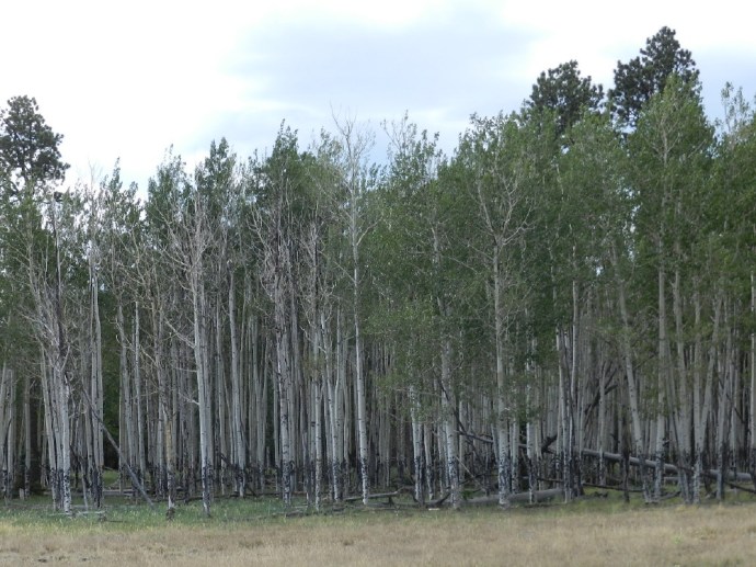 Curiosity beckons. Across the vast field bordering our chosen campsite, is a dark band across the bottom of the white bark trunks of a grove of white aspen. It is a dark line and we want to investigate its origin. What is causing such a consistent line?